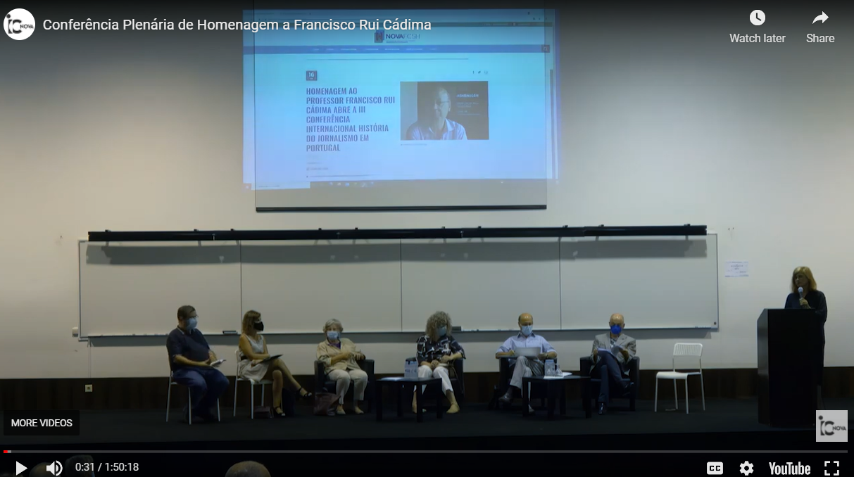 Da esquerda para a direita: Professores Jorge Pedro de Sousa, Cristina Ponte, Joana Cunha Leal (Direção FCSH), F. Rui Cádima, Paulo Filipe Monteiro e Carla Baptista (Campus de Campolide da NOVA/Colégio Almada Negreiros, 16 de setembro de 2021). https://www.youtube.com/watch?v=DYOW51Xiezw&t=31sCom Maria do Carmo Piçarra e Paulo Cunha. Lançamento do livro Projectar a Ordem — Cinema do Povo e Propaganda Salazarista. Cinemateca Portuguesa, 30 de setembro (fotos de José da Costa Ramos).